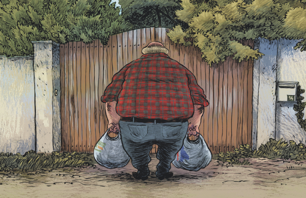 Vincenzo Bizzarri apporte le même soin documentaire à ses décors. Le portail présent sur la couverture est exactement celui de la demeure d’Albertine Haye, en dehors du numéro sur la boîte aux lettres. Que ce soit dans les extérieurs du village ou les intérieurs des maisons ou administrations, les environnements sont réalistes au possible. L’illustrateur italien propose toutefois des personnages plus caricaturaux, tantôt avec de longs nez, tantôt avec des corps exagérés, même si le maire Gilles ressemble beaucoup à son modèle, Daniel Chevée. Bien qu’aux styles assez antinomiques, les acteurs et les décors se fondent merveilleusement bien dans un ensemble étonnamment cohérent, notamment grâce aux couleurs sobres de Vincenzo Bizzarri.