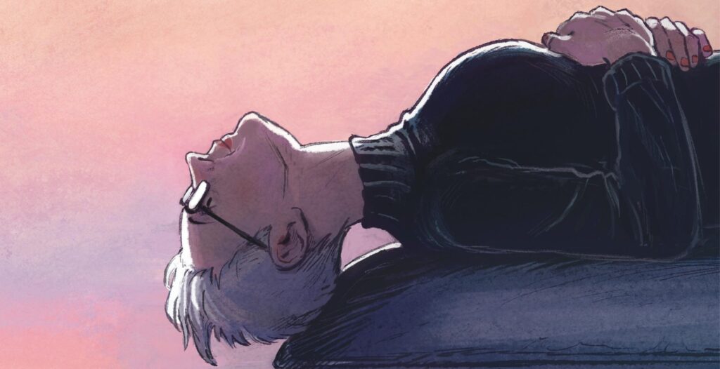 La délicatesse du trait d’Aimée de Jongh fait écho à la douceur du scénario. L’ambiance hivernale qui accompagne le récit est parfaitement restituée. La dessinatrice néerlandaise, qui réalise également les couleurs, livre une très jolie partition avec une mention spéciale pour la représentation très juste et sans faute de goût des corps nus de deux femmes sexagénaires tendrement enlacées. Certaines planches sont splendides, rehaussées par des couleurs pastel qui accentuent le sentiment de bienveillante que peut ressentir le lecteur envers Josy, malgré les coups durs que la vie lui porte symbolisés par une bague de mariage omniprésente qui ne se détache jamais de l’annulaire de notre héroïne. Certaines scènes entre coupent le récit et nous rappellent qu’on se ne défait jamais totalement de 35 ans de vie commune, qu’on est toujours un peu prisonnière de son passé. Le lecteur se prend d’affection pour une Josy combative et même lorsqu’un coup du sort la ramène chez elle, reprend ses esprits pour tenter de reprendre à nouveau sa liberté.