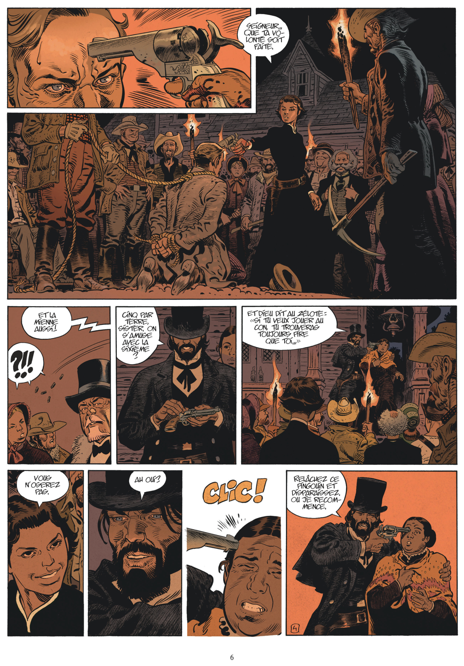 Le premier tome, commercialisé le 10 novembre 2023, se concluait avec un Jonas en bien mauvaise posture. 679 jours plus tard, le lecteur découvre enfin comment le croque-mort va s’en sortir. Une attente longue mais qui se justifie largement à chaque planche tant Ralph Meyer maîtrise son art. Alternant scènes d’action à couper le souffle, dialogues plus intimes sous haute tension ou discours charismatiques presque bibliques, le dessinateur semble à l’aise dans chaque ambiance, dans chaque rythme. Les décors sont également superbes et parfaitement détaillés, et Ralph Meyer sait en tirer le meilleur parti pour leur faire tenir un rôle dans l’intrigue ou sa mise en scène. Les couleurs, qu’il assure avec Caroline Delbie accentuent encore l’immersion du lecteur en créant des atmosphères toujours justes.